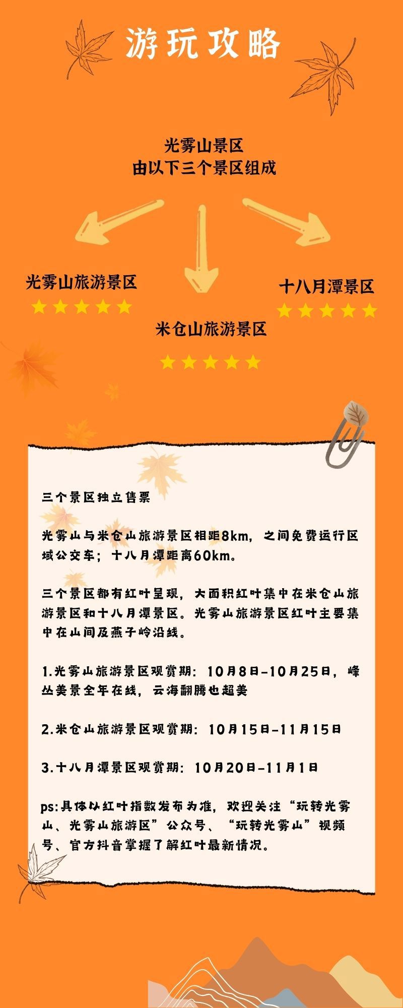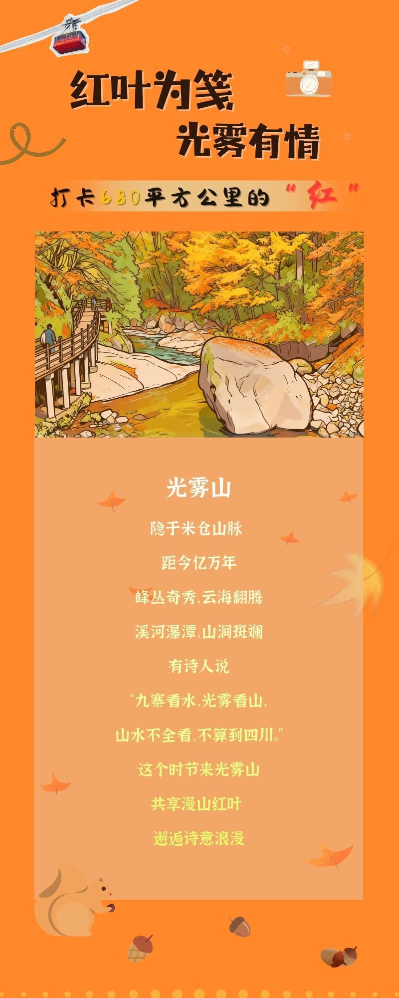 “九寨看水,光雾看山,山水不全看,不算到四川。”红叶最佳观赏季来临之际,让我们一起走进中国红叶黄金走廊第一站光雾山,享漫山红叶,邂逅诗意浪漫。