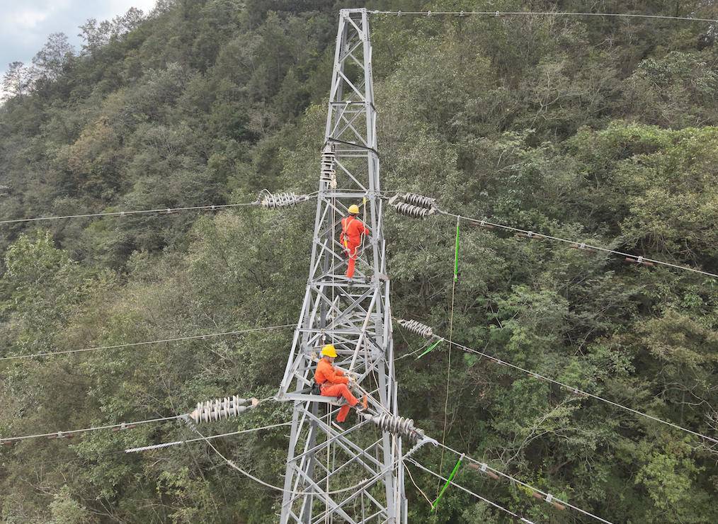 10月10日,国网巴中供电公司组织两支抢修队伍,在巴中通江县两河口镇二里坝村,对35千伏永河线68至70号铁塔开展绝缘子更换工作。