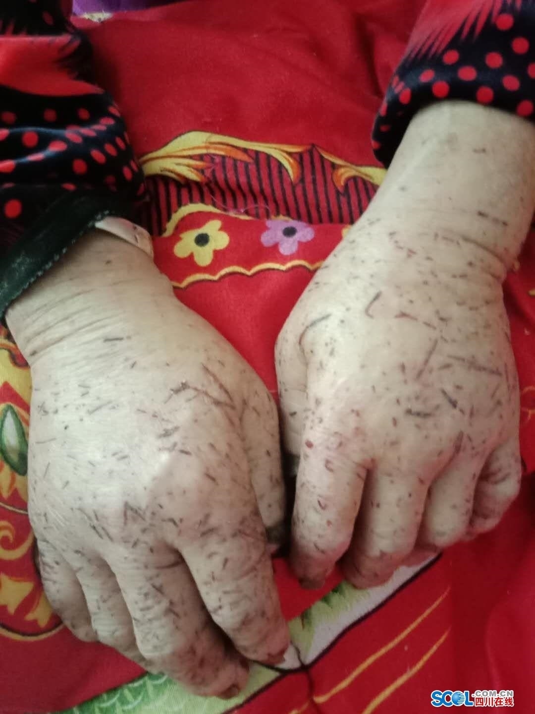 据老人幺女儿张女士介绍,当天找到老人的地方距离老人走丢的地方还是有一定距离,可能到了晚上,老人走到都是荒坡或荆棘的区域,身上才被刺划出多条小伤口”。