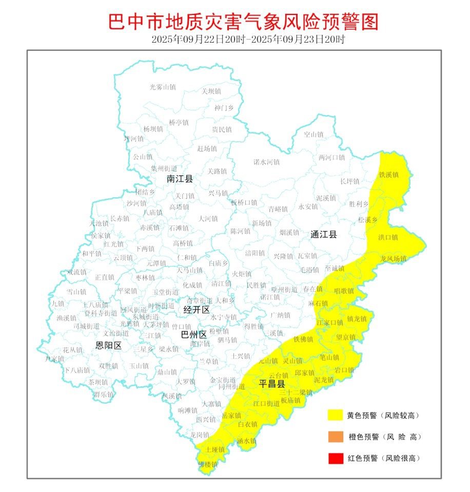 9月22日17时,巴中市地质灾害防治指挥部办公室发布了9月22日20时至9月23日20时巴中全市地质灾害气象风险预警。其中,三级·黄色预警区域为通江县:铁佛、麻石、至诚、洪口、铁溪、毛浴、龙凤场、春在、唱歌、长坪、松溪、胜利;平昌县:同州、金宝、江口、西兴、佛楼、白衣、涵水、岳家、元山、云台、邱家、笔山、镇龙、灵山、望京、泥龙、板庙、龙岗、大寨、土垭、三十二梁、江家口、岩口。