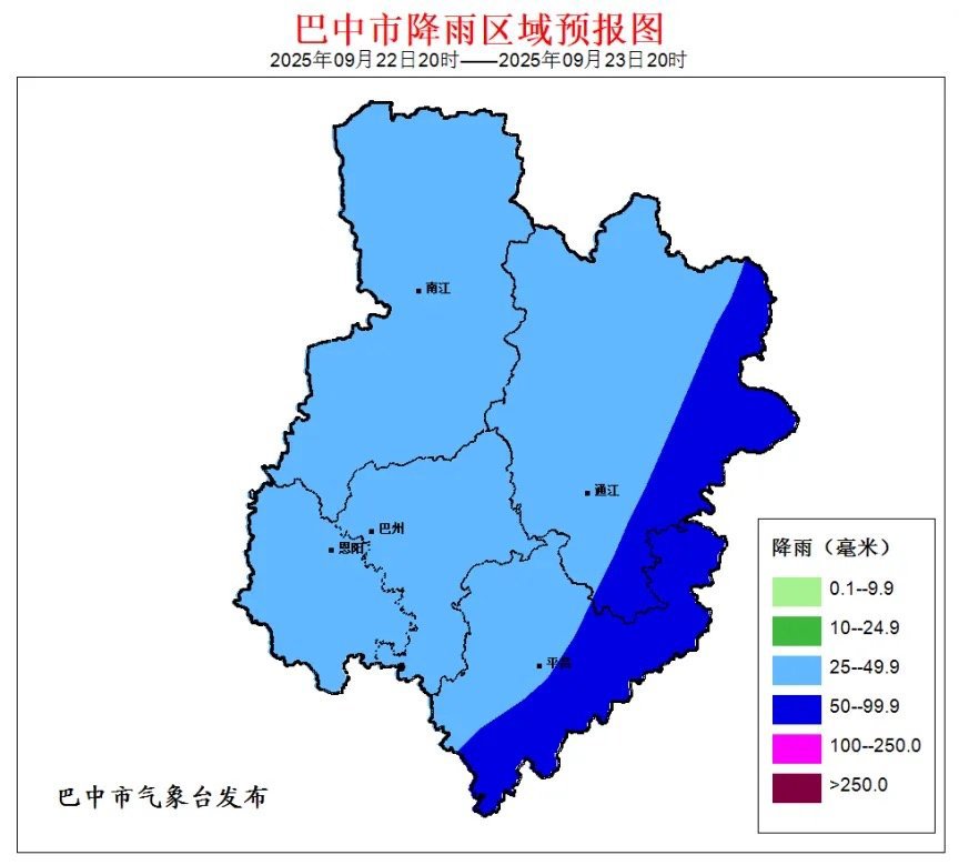 据气象预报预计,9月22日夜间至23日白天,巴中市有一次强降雨天气过程,雨量大到暴雨。