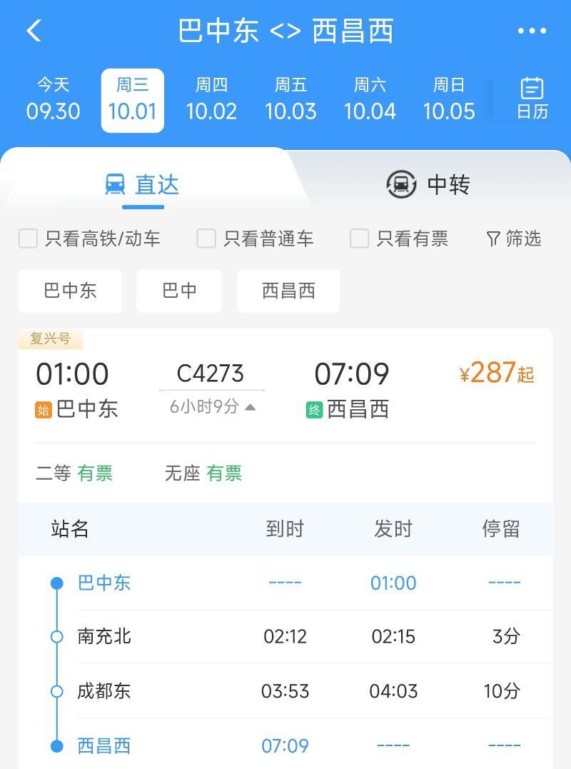 巴中东至西昌西C4273次动车,10月1日01:00巴中东始发,07:09抵达西昌西,沿途停靠南充北(02:12/02:15)、成都东(03:53/04:03),全程用时6小时9分。