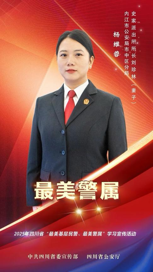 杨维蓉,内江市东兴区人民法院法官,内江市公安局市中区分局史家派出所民警刘珍林的妻子。曾荣立个人三等功1次,被嘉奖1次,连续5年获评优秀公务员,多次被评为“优秀共产党员”。她在法槌与烟火之间,寻得了属于自己的平衡之道,以温柔守护家庭,以担当诠释新时代女性的风采。