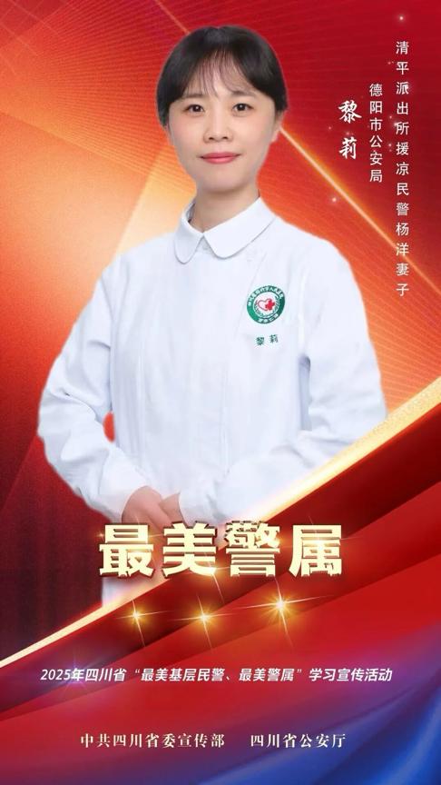 黎莉,女,汉族,四川资中人,1990年1月出生,群众,2012年4月参加工作,现为绵竹市人民医院采血组主管护师,系绵竹市公安局清平派出所援凉民警杨洋妻子。