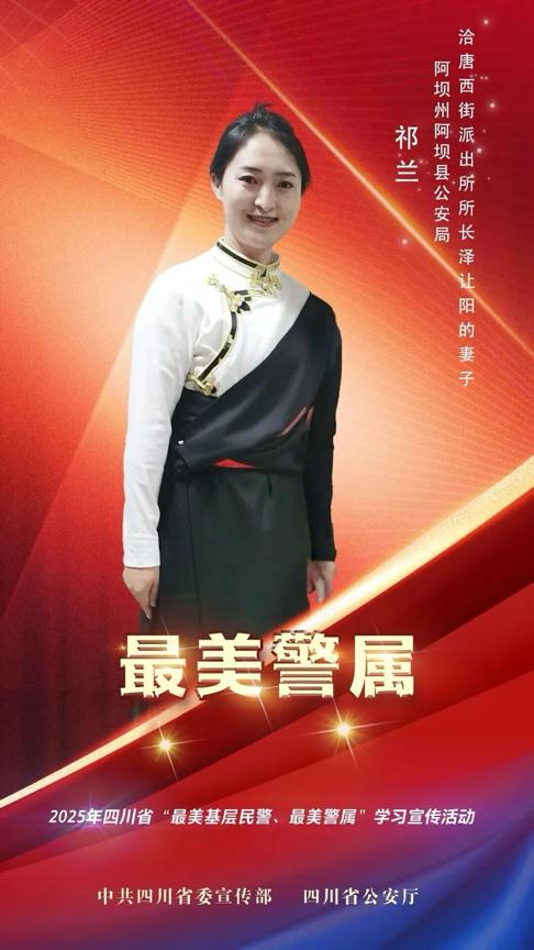 祁兰,女,37岁,藏族,阿坝州阿坝县人力资源和社会保障局劳动争议仲裁院院长,阿坝州阿坝县公安局洽唐西街派出所所长泽让阳的妻子,曾荣获“好警嫂”“最美政法家属”“脱贫攻坚先进个人”“优秀第一书记”等荣誉称号。