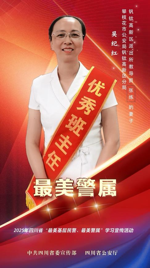 吴纪红,女,49岁,汉族,攀枝花市二小龙珠学校一级教师,攀枝花市公安局(因公牺牲)民警张炼的妻子,曾荣获“攀枝花市优秀德育工作者”“全国青少年普法教育先进个人”“四川省优秀少先队辅导员”“攀枝花市优秀班主任”等诸多荣誉。