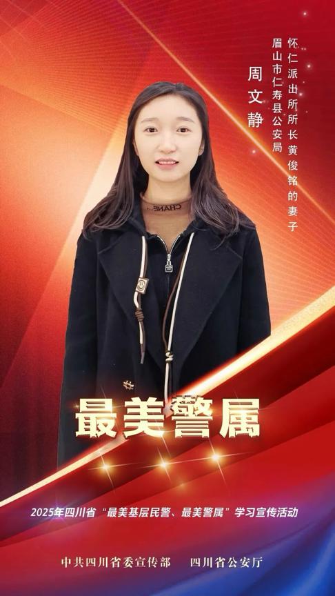 周文静,女,34岁,汉族,仁寿旌凯投资集团有限公司董事长助理,眉山市仁寿县公安局怀仁派出所所长黄俊铭的妻子,曾荣获“优秀党务工作者”“十佳警属”“先进个人”等称号。