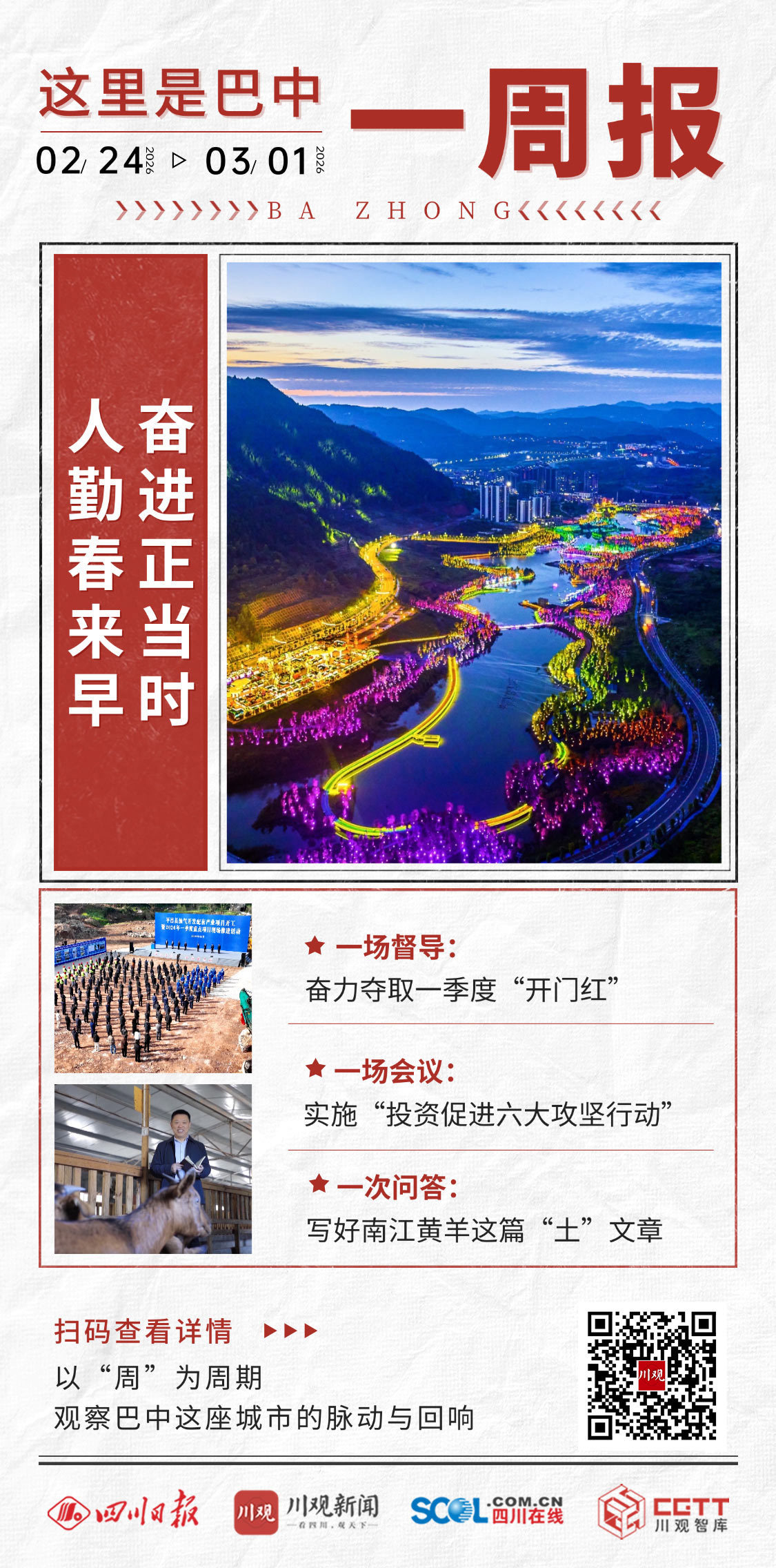 2月24日至3月1日,是新春第一个工作周。在这周里,让我们从一场调研督导、一场专题会议和一次“问答对”中,看老区巴中如何按下复工复产和项目建设的快进键、如何吹响高质量发展的进击号、如何写好乡村振兴这篇大文章。