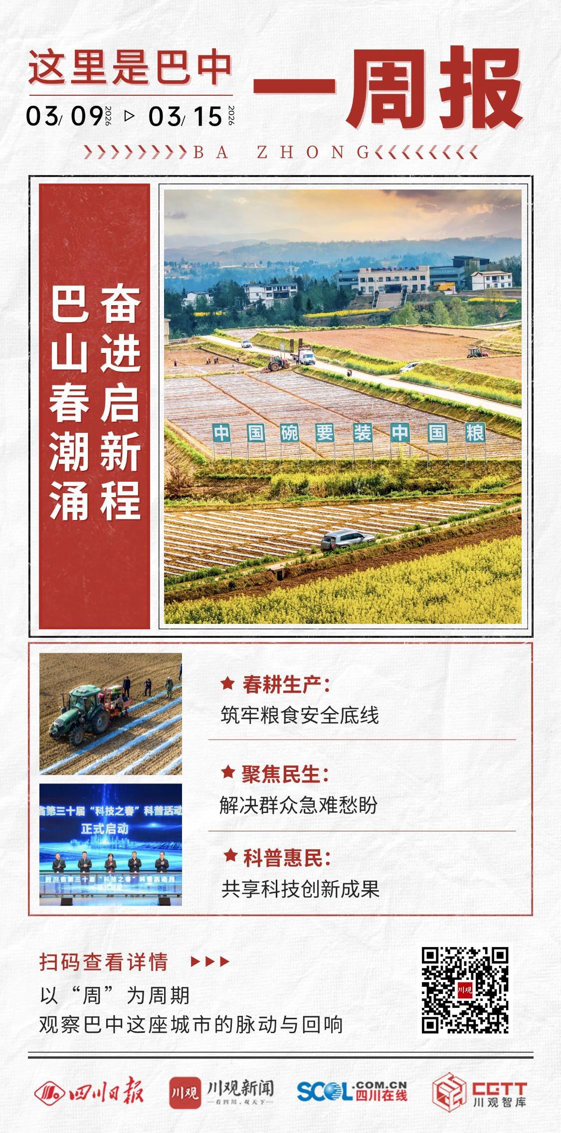 巴山春潮涌,奋进启新程。3月9日至3月15日,又一周过去。在这个春光里,巴山大地春潮涌动:乡野田间,春耕生产为今年丰收播下希望的种子;会议部署,紧盯小切口破题解决群众急难愁盼;活动现场,老区插上逐梦科学的翅膀……