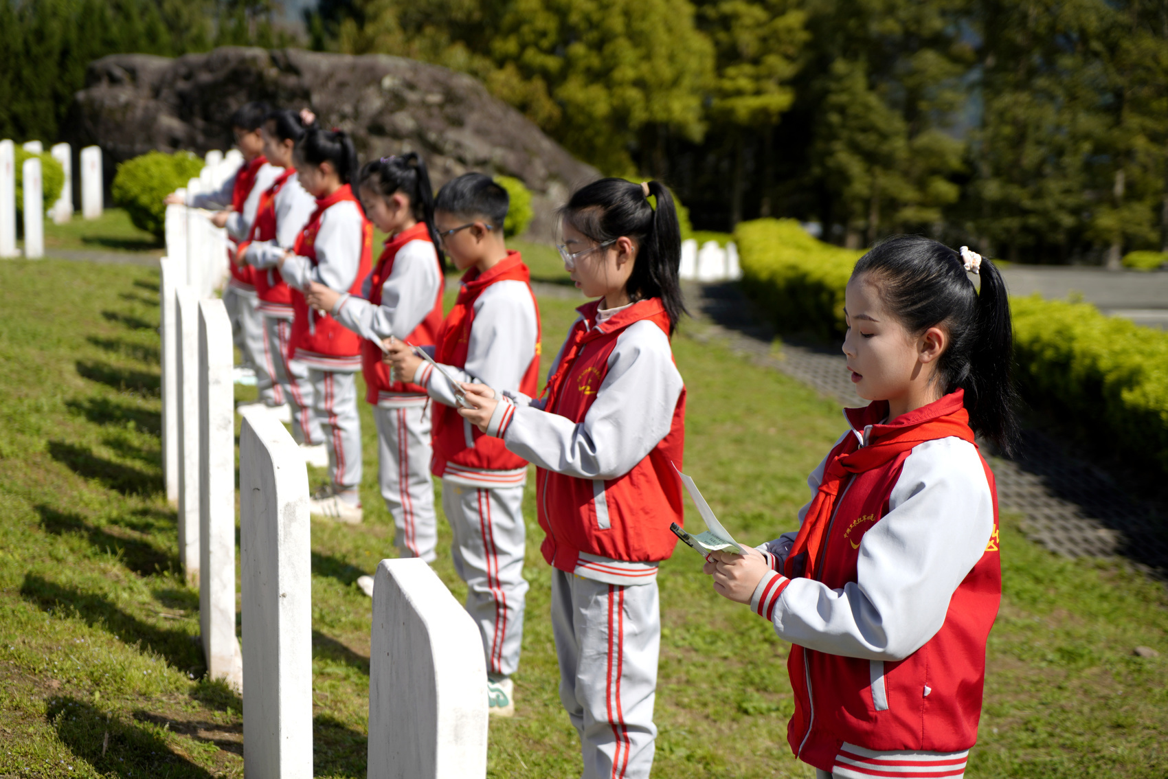 4月1日,四川巴中通江县川陕革命根据地红军烈士陵园内,通江李先念红军小学的少先队员面向烈士墓碑,深情诵读缅怀英烈书信。