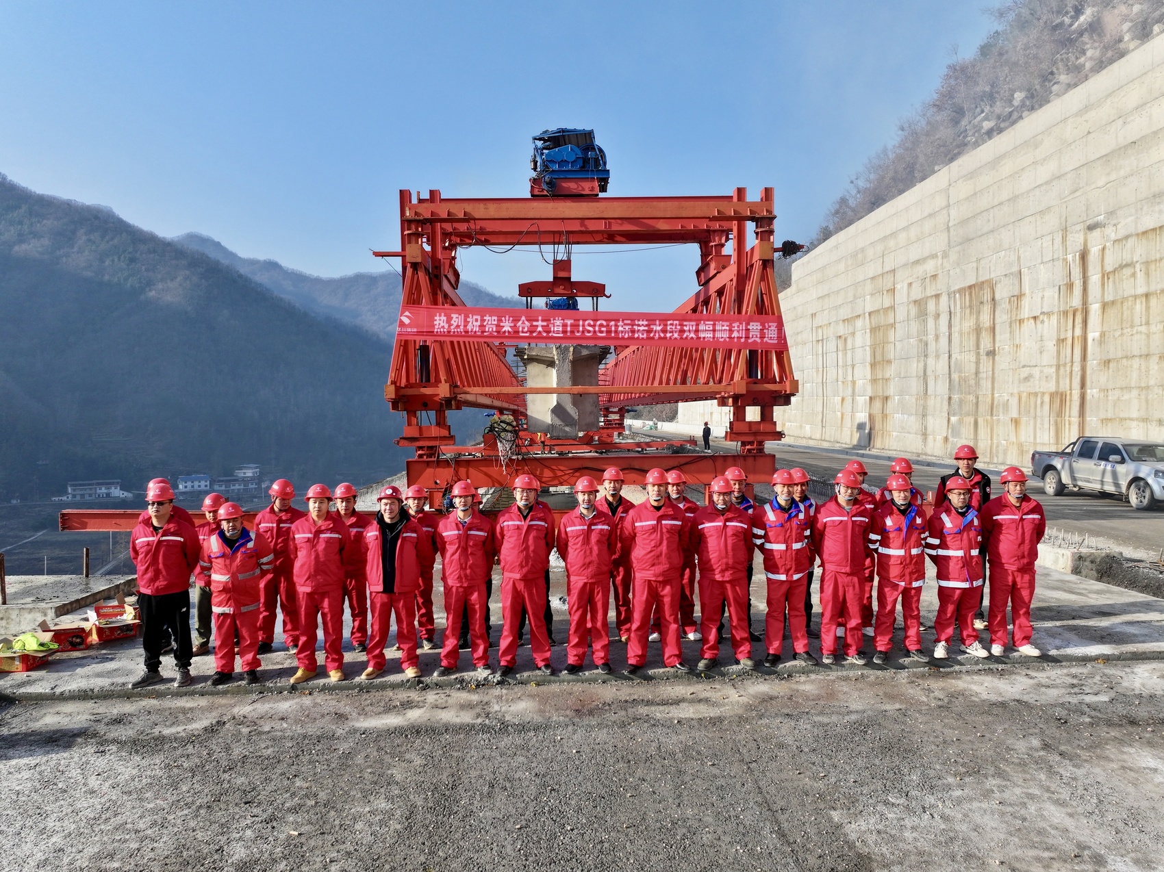 1月12日上午10时,随着巨型架桥机将最后一片T梁精准平稳安放在临江3号大桥预定桥墩上,米仓大道TJSG1标项目诺水河段所有梁板架设任务圆满完成,主线成功实现双幅贯通。
