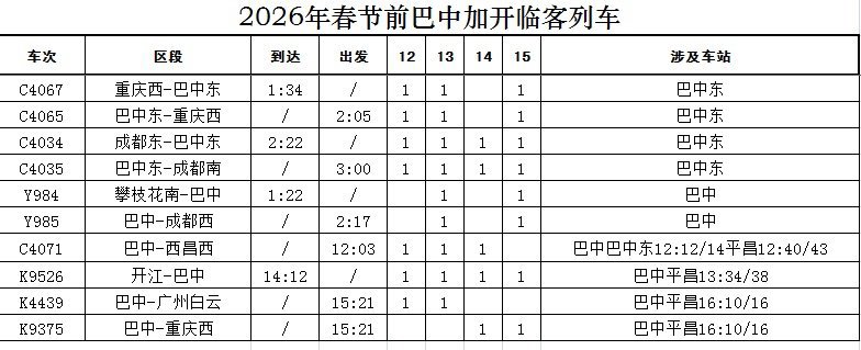 本次加开列车涉及巴中东站、巴中站、巴中平昌站等多个客运站。铁路部门提醒广大旅客,具体列车停靠站点、到发时刻及余票信息,请以12306官方网站、手机APP实时查询结果为准。建议旅客提前规划出行行程,错峰购票乘车,乘车过程中注意文明行为,共同维护安全、有序、温馨的出行环境。