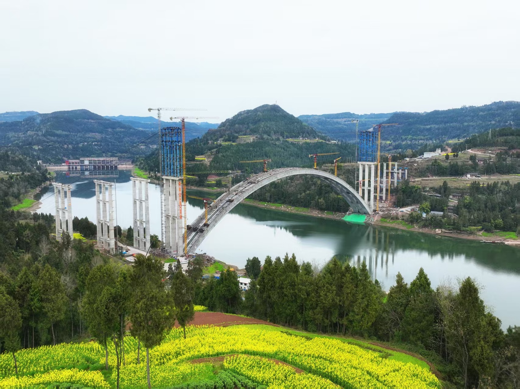 春光作序,万物竞发。3月10日,镇广高速公路C4项目建设繁忙有序:在镇广高速云台通江河特大桥施工现场,塔吊林立、焊花飞溅,桥梁拱圈已初具雏形,宛如一道钢铁长虹横跨通江河两岸。数十名施工人员分布在拱圈之上,正开展拱上立柱钢筋绑扎作业,各道工序严谨有序、稳步推进。