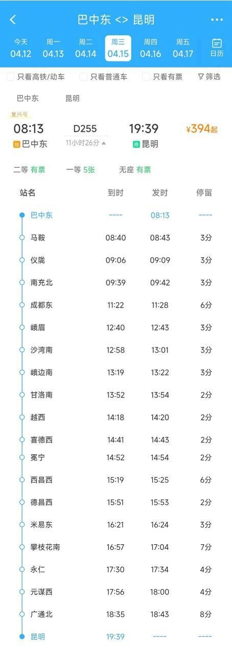 巴中东至昆明D255次列车,巴中东始发时间调整至08:13,抵达成都东时间仍为11:22,抵达昆明时间仍为19:39,全程运行11小时26分,增加马鞍站停靠。