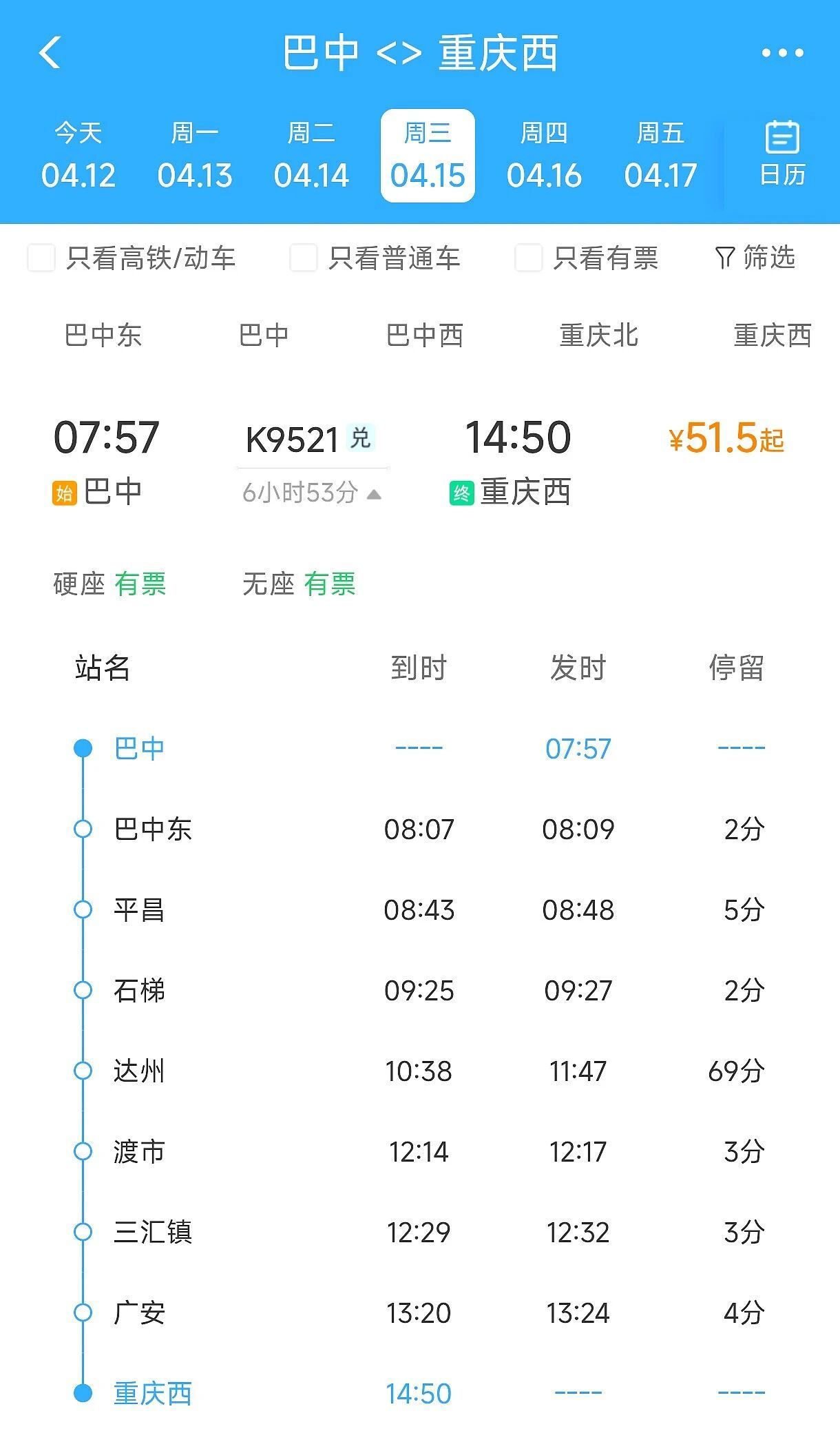 巴中至重庆西K9521次列车,巴中始发时间调整至07:57,巴中东始发时间调整至08:09,抵达重庆西时间仍为14:50,全程运行6小时53分。