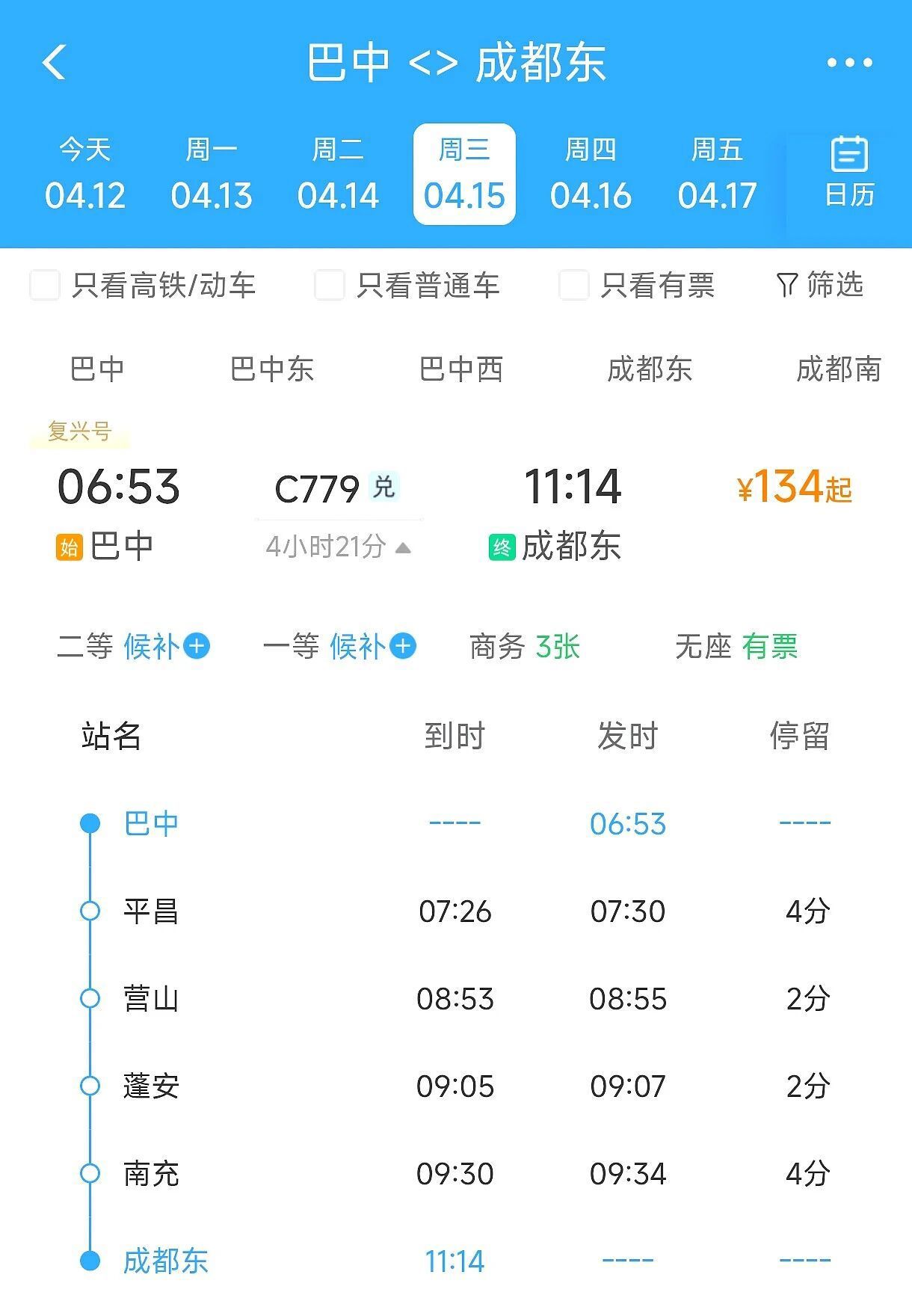 巴中至成都东C779次列车,巴中始发时间调整至06:53,抵达成都东时间仍为11:14,全程运行4小时21分。