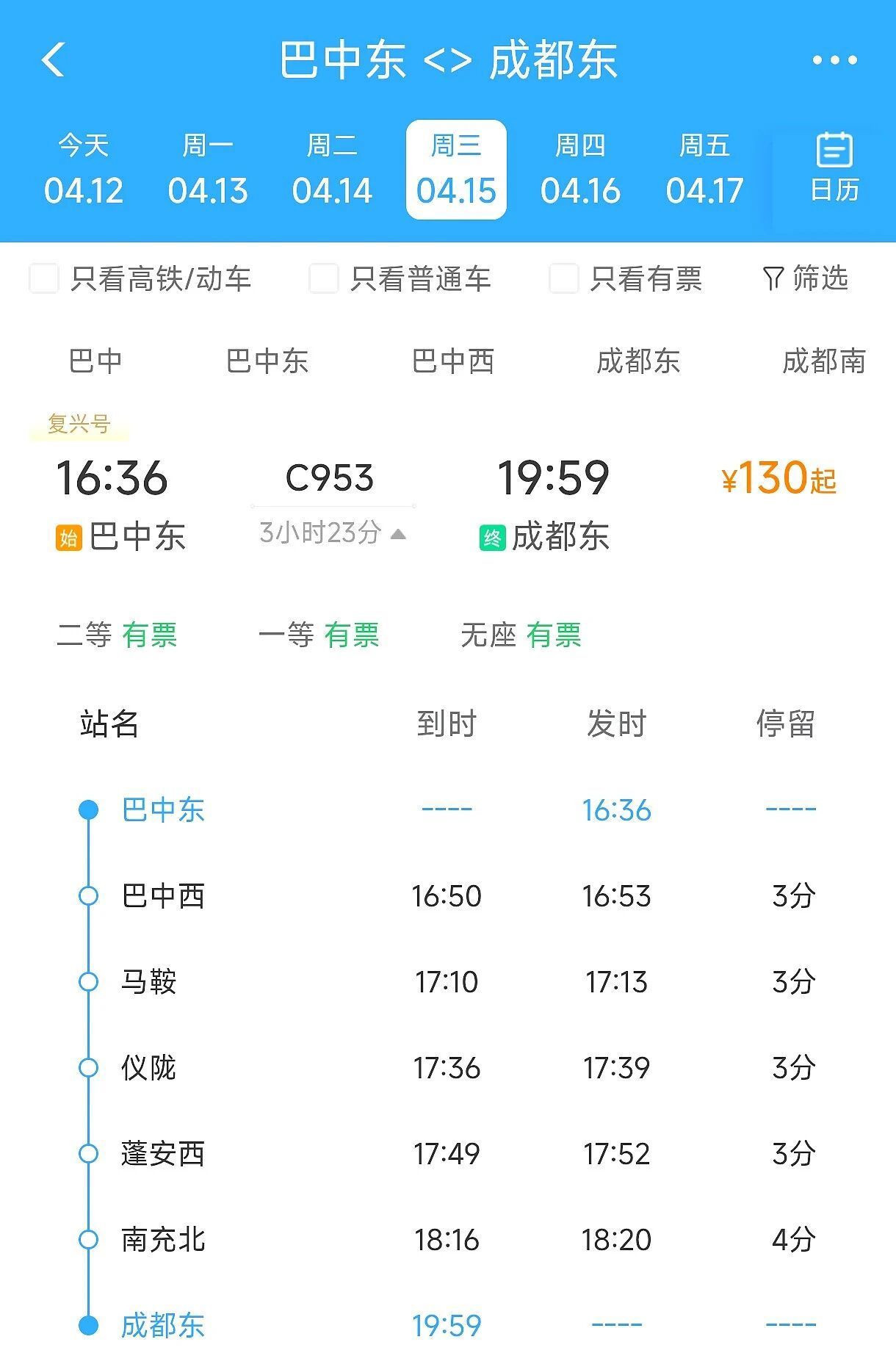 巴中东至成都南的C953次列车终到站由成都南调整至成都东,始发时间和终到时间保持不变,巴中东始发时间仍为16:36,巴中西始发时间仍为16:53,抵达成都东的时间仍为19:59,全程运行3小时23分。