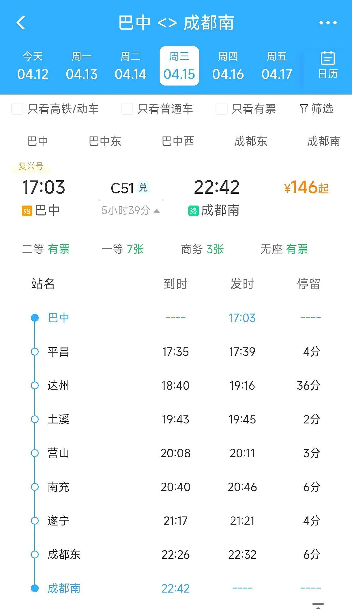 巴中至成都南C51次列车,巴中始发时间调整至17:03,抵达成都东时间仍为22:26,抵达成都南时间仍为22:42,全程运行5小时39分。