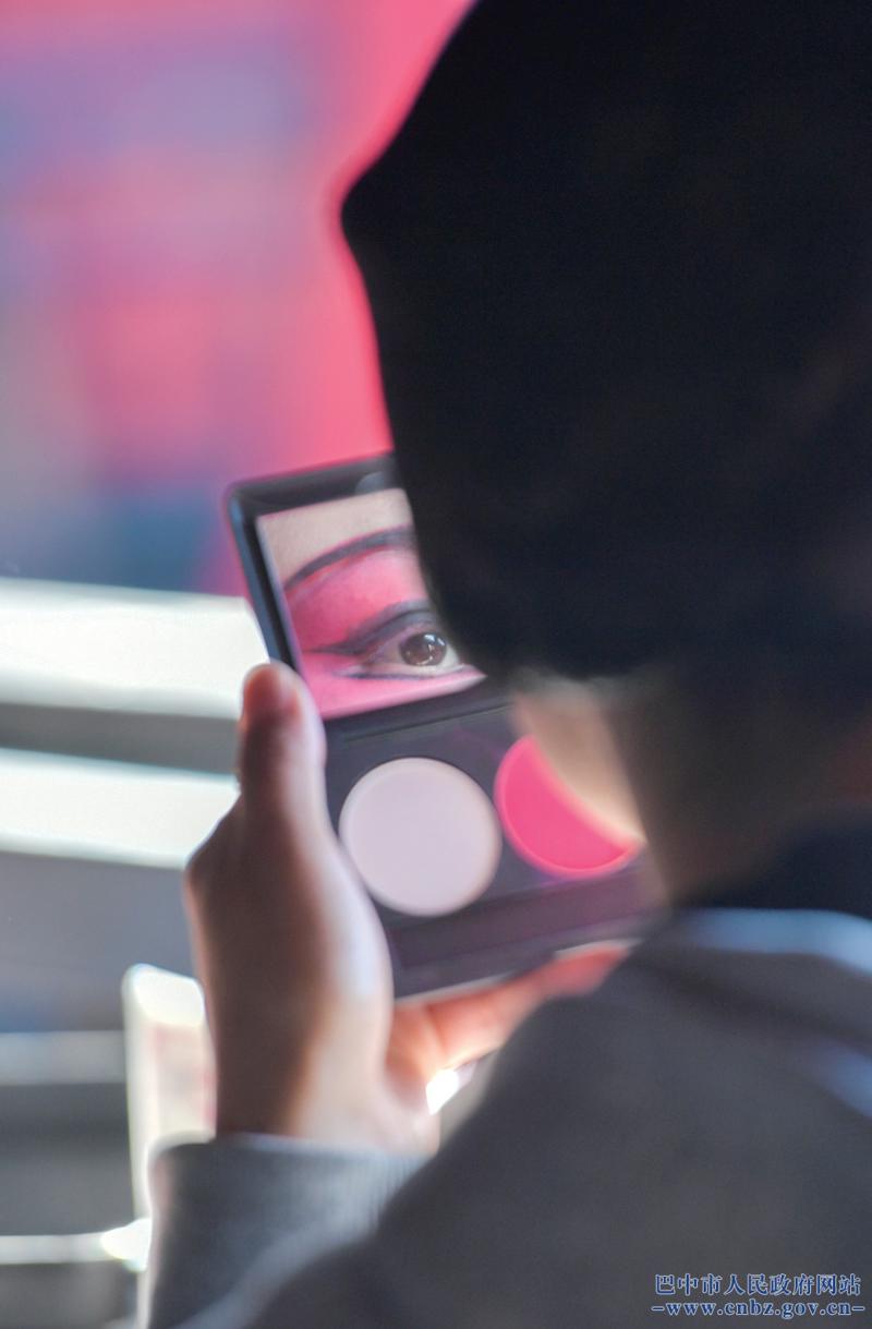 川剧演员对着化妆盘细致描摹妆容