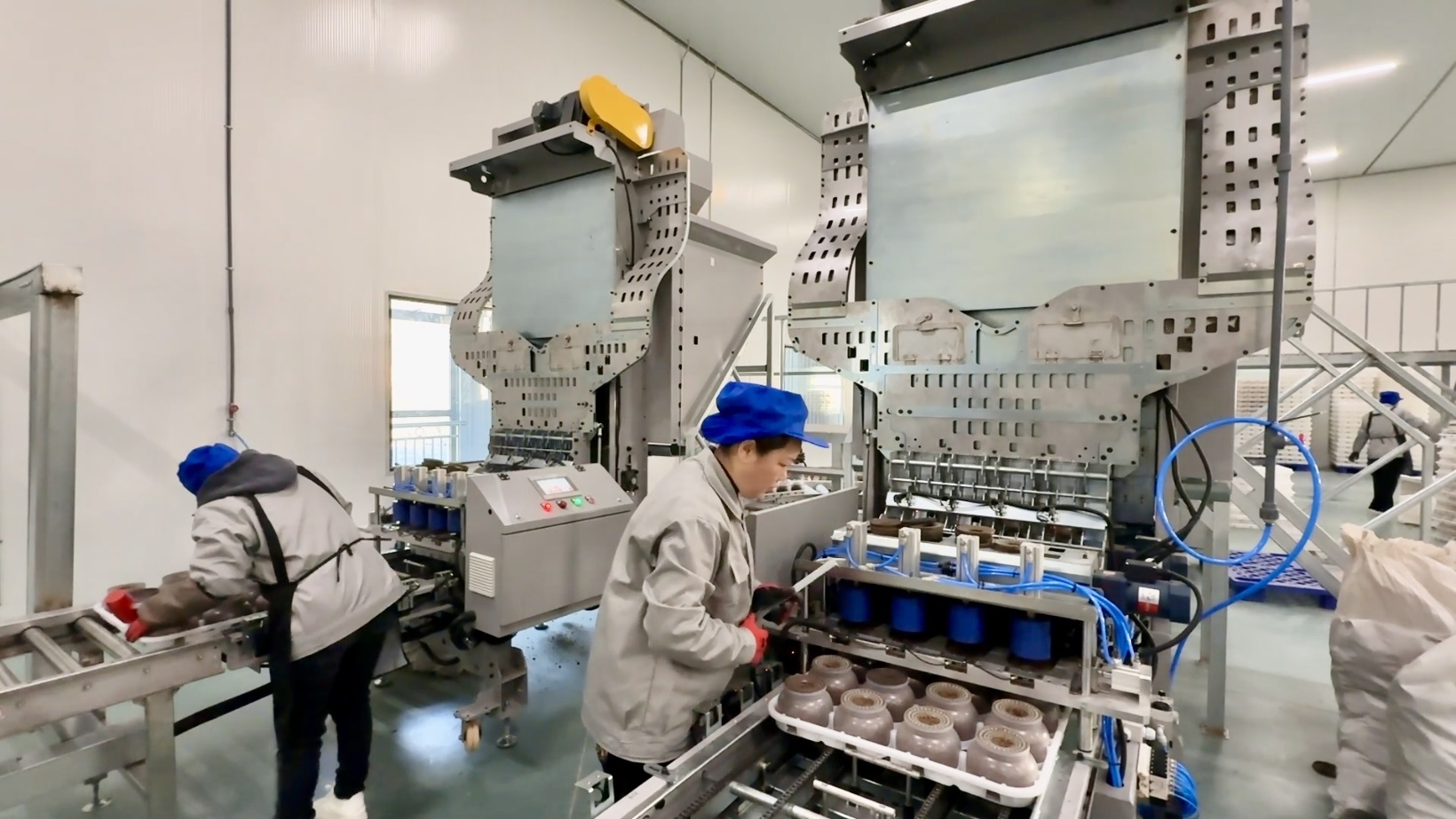当天,瓶装车间里,自动化生产线正有条不紊地运转,依次完成拌料、装瓶、灭菌、接种等全流程作业。原料经精准配比后装入培养瓶,经高温灭菌处理后,通过密闭输送系统衔接至接种环节,全程无需人工直接接触。