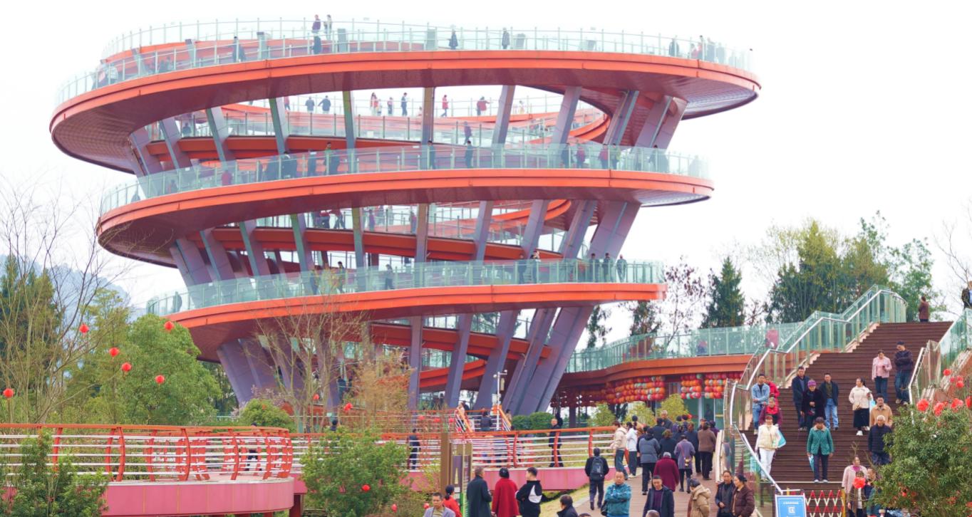 相较于登科山的文化氛围,大梁山则多了几分家庭的温情与烟火气。一大早,市民与游客们沿着蜿蜒的步梯与登山道,三五成群地向着山顶公园进发。沿着螺旋上升的通道缓步攀登,最终抵达山顶标志性建筑——“未来之眼”观景台。站在高处极目远眺,整座城市的崭新风貌尽收眼底,令人心旷神怡。