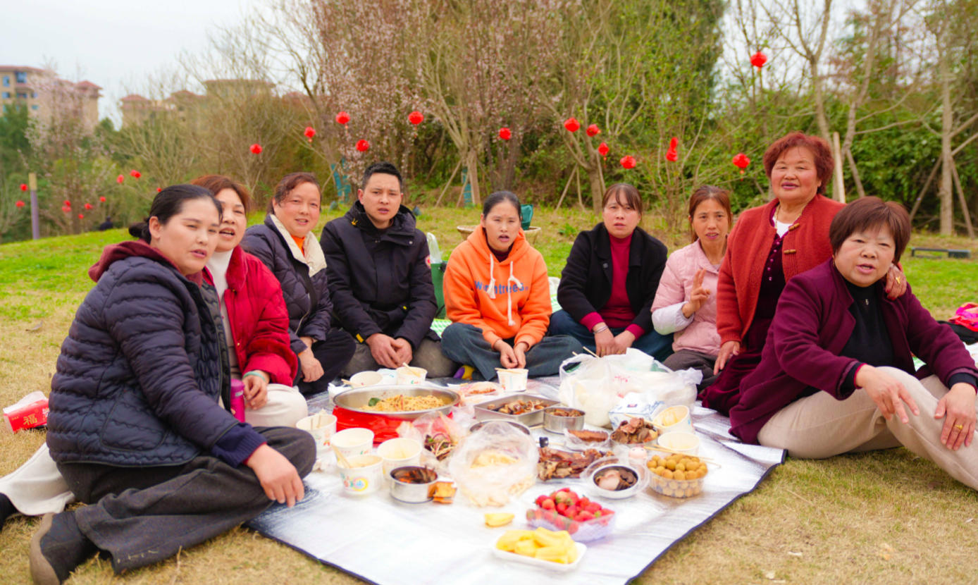 山间步道旁,不少群众铺上野餐垫,摆放着香肠、腊瘦肉、豆腐干等特色美食,一家人围坐在一起,一边品尝美食,一边畅谈家常,欢声笑语回荡在山间。