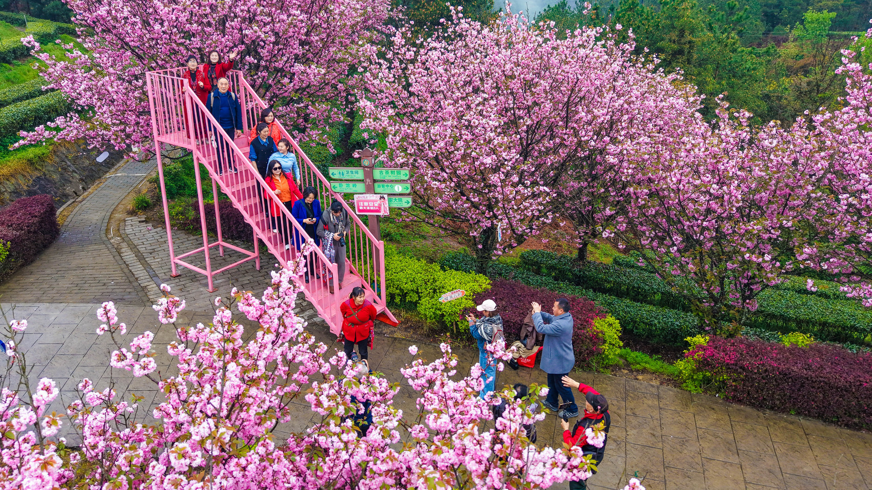 平昌县三十二梁景区,粉嫩的樱花与翠绿的茶垄相映成趣,吸引游客前来体验采茶。