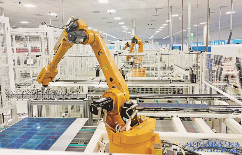 三一硅能·南江2GW高效晶硅光伏组件生产基地的排版机器人正在进行精确定位排列