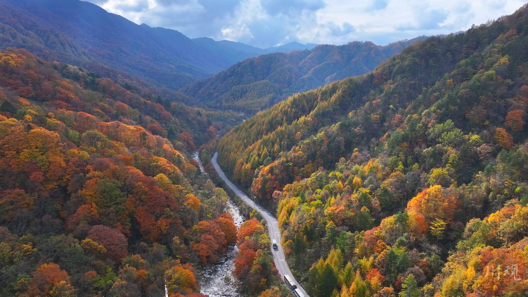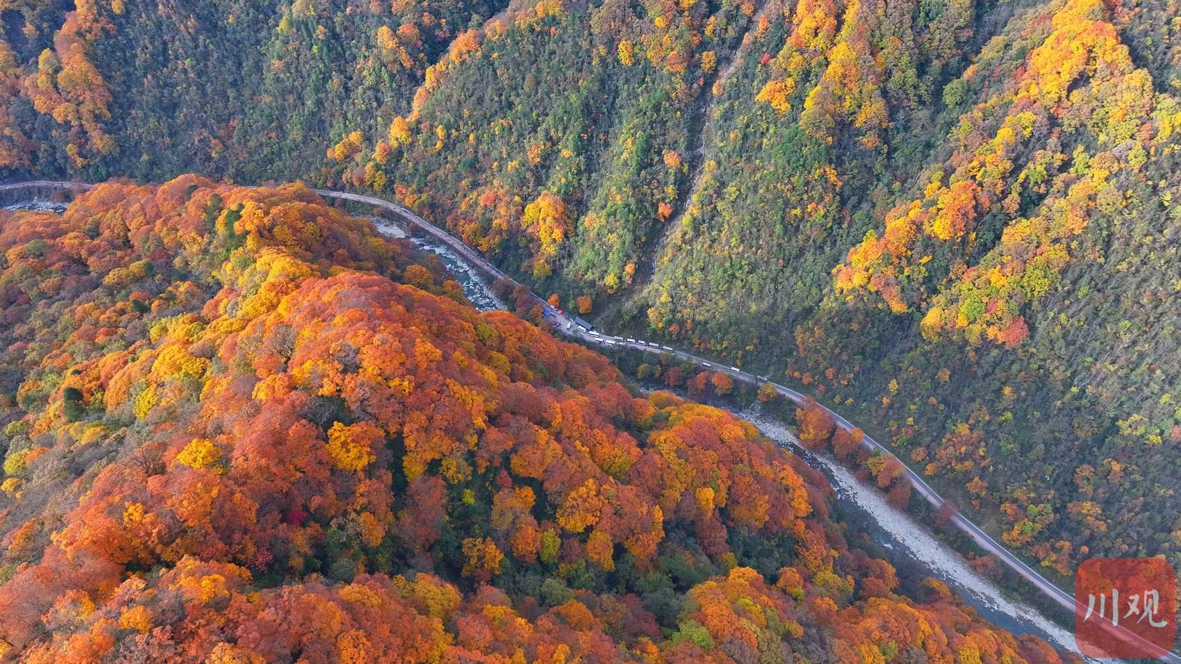 11月8日,巴中南江县米仓山,茫茫林海换上深红、橙红、金黄的彩色盛装,将山谷原野装点成一幅幅色彩斑斓的天然画卷。