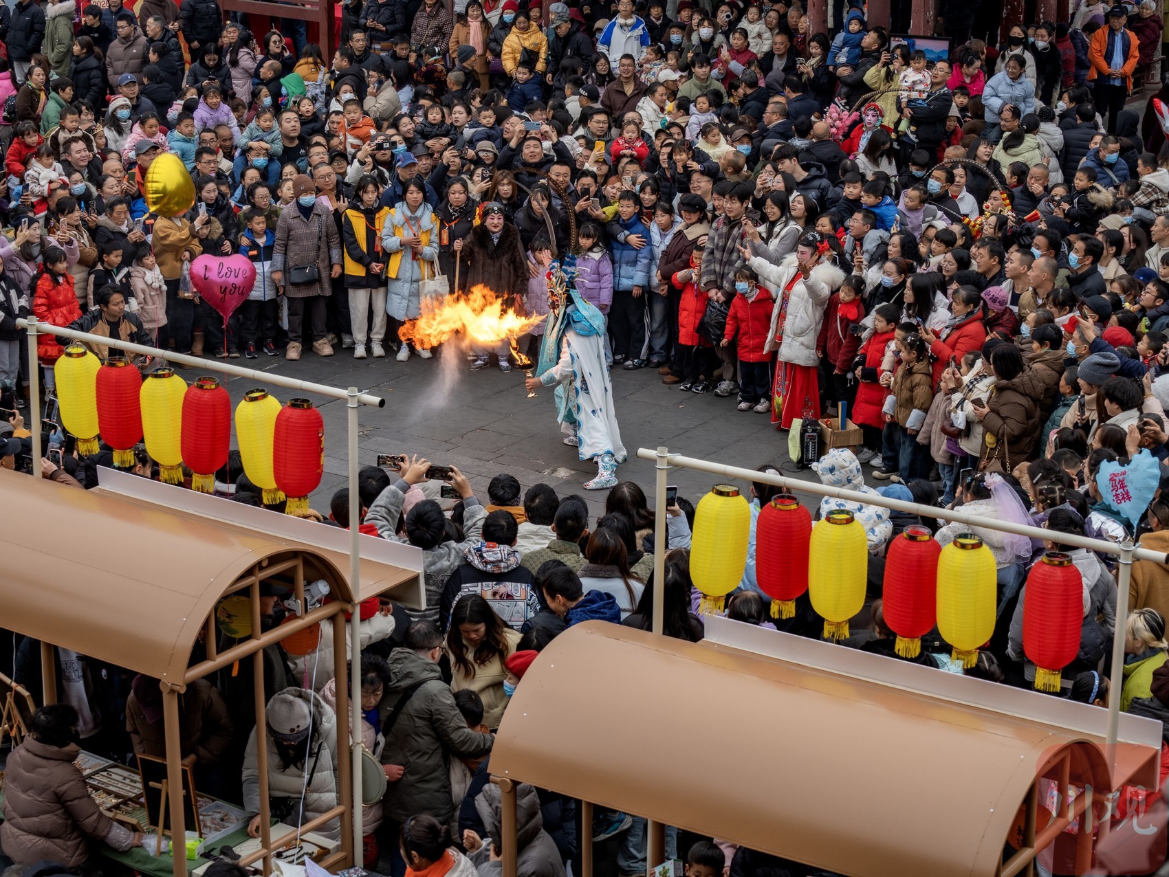 1月1日,温江文庙“村糖会”热闹启幕,活动现场人潮涌动,精彩的喷火表演更是赢得观众喝彩。