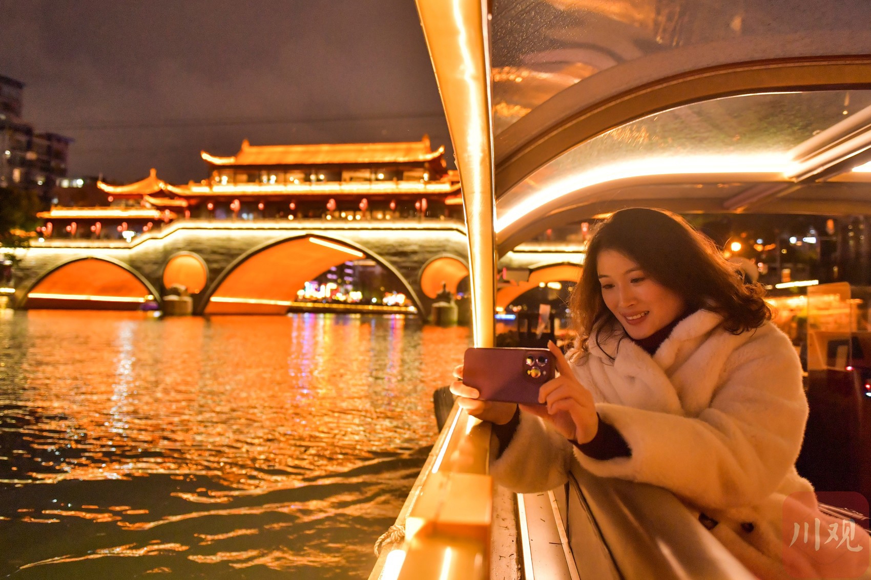 1月2日晚,成都“夜游锦江”活动游人如织,游客乘船赏景、逛集品美食,在桨声灯影间感受城市夜经济活力。