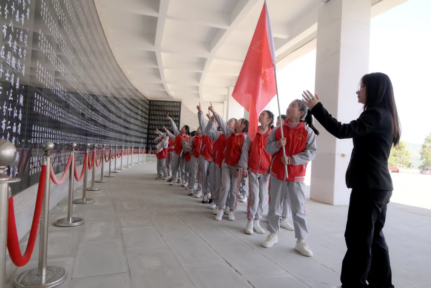 孩子们在英烈墙前久久驻足,仰着头,目光专注。有人轻声念出墙上的名字,有人默默低下头。
