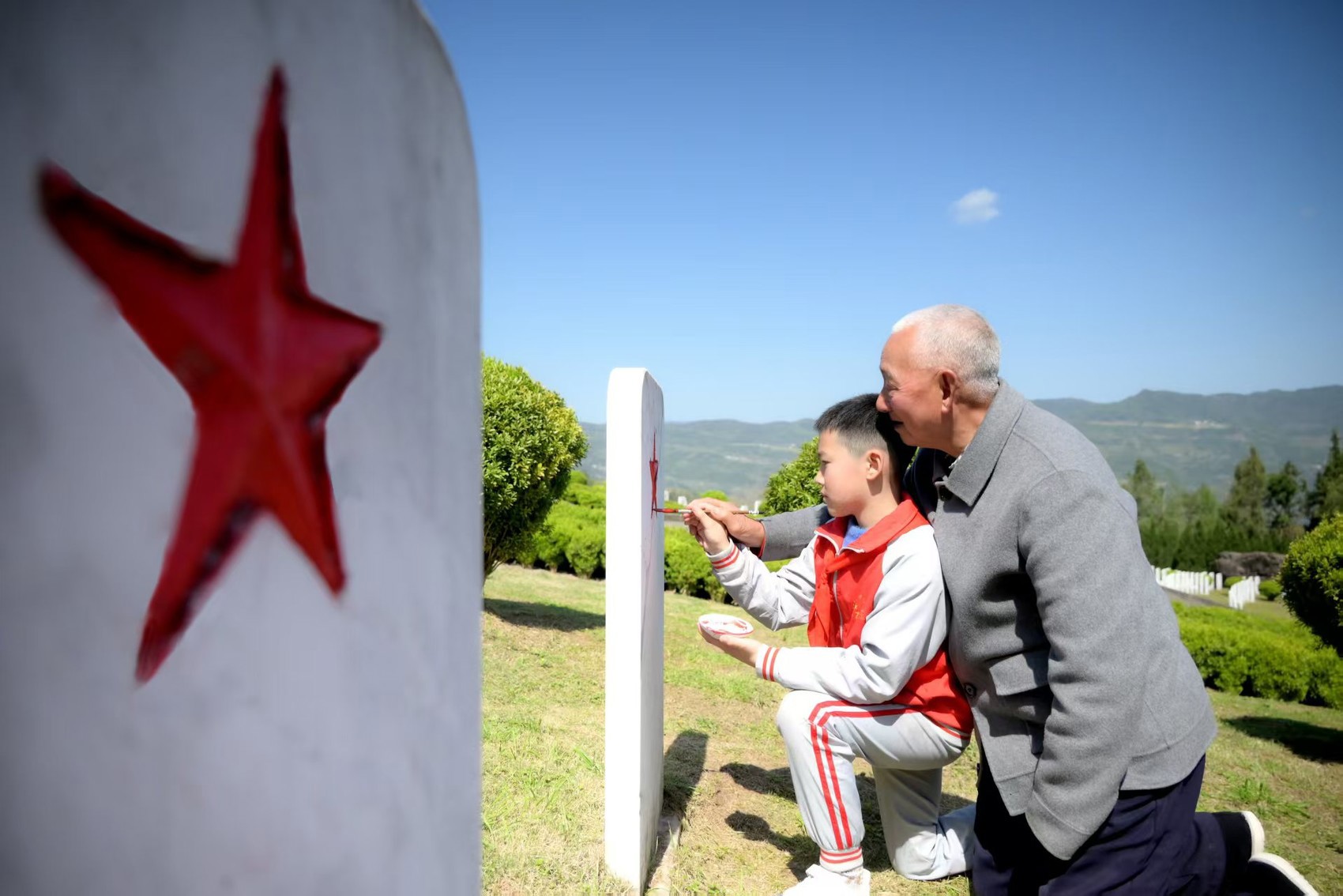 描红持续了整个上午。当最后一座墓碑上的五角星被描亮,孩子们站起身,回头望去一整片墓区的红星在阳光下熠熠生辉。