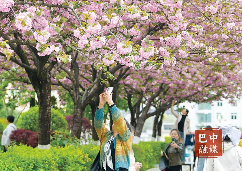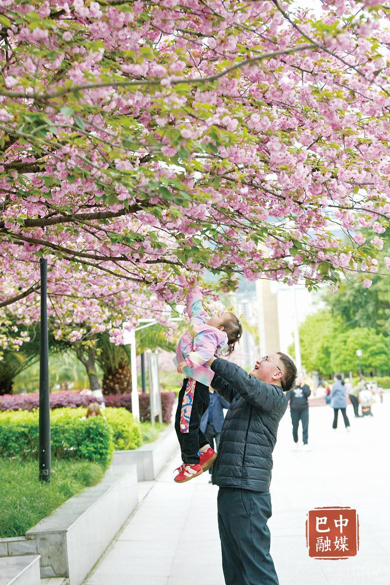 4月5日,在巴城城市广场,樱花竞相绽放,粉白相间的花朵缀满枝头,引来不少市民游客前来享受春日的美好。