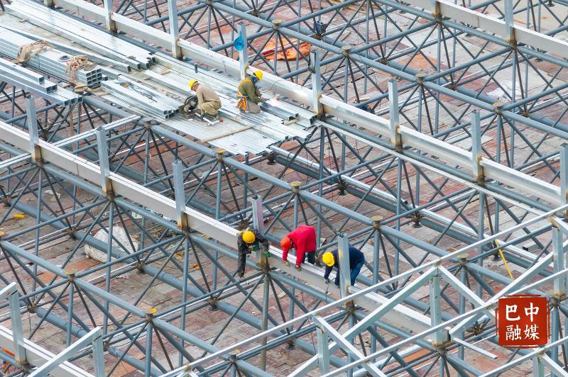 下工人正在体育馆屋顶进行钢构安装作业