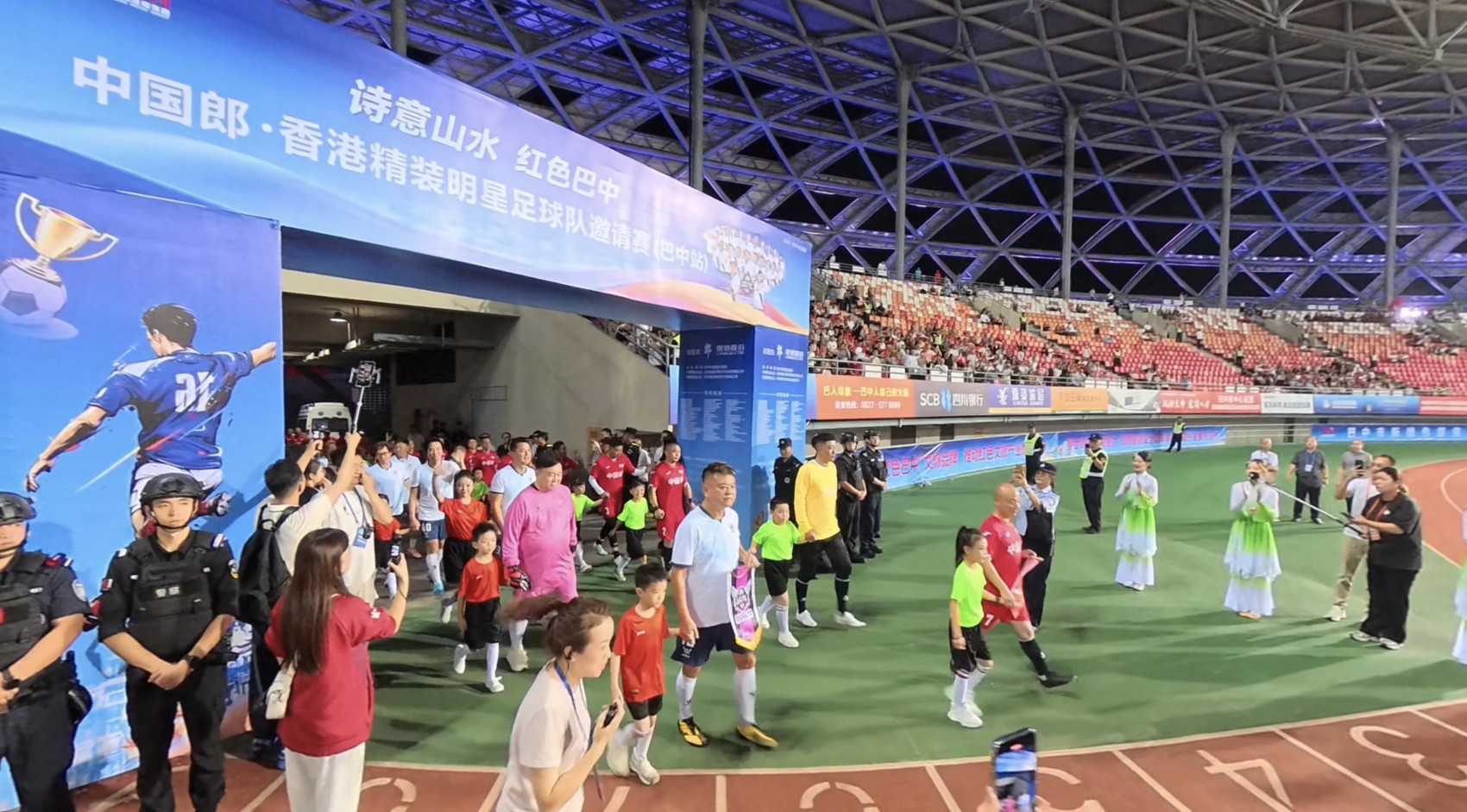 “雄起!雄起!”当晚7时30分许,伴随着巴中经开区体育馆内上万人的激情呐喊声和热烈掌声,此次赛事的两大主角:香港精装明星足球队和来自巴中的中国郎足球队携手小球童缓缓入场。一时间,整个体育中心一片沸腾,一场足球、港星、演艺碰撞交织的文化盛宴正式拉开帷幕!