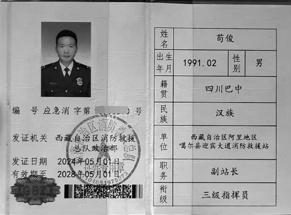苟俊牺牲前系西藏自治区阿里地区噶尔县迎宾大道消防救援站副站长。巴中市委政法委供图
