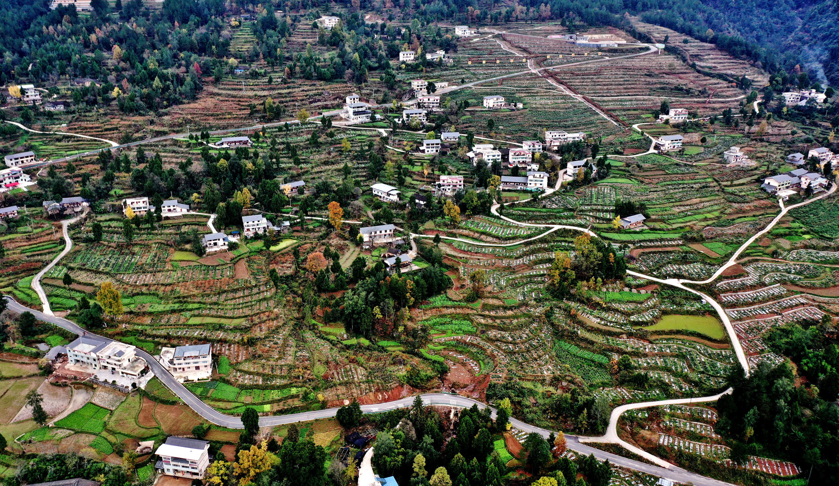 1月12日,巴中市南江县大河镇芭蕉溪村,蜿蜒的道路、白墙黛瓦的民居与连片的金银花产业园、田间树木及四面青山交相辉映,构成一幅产业兴、农民富、乡村美的和谐美丽乡村画卷。 肖定怀 摄
