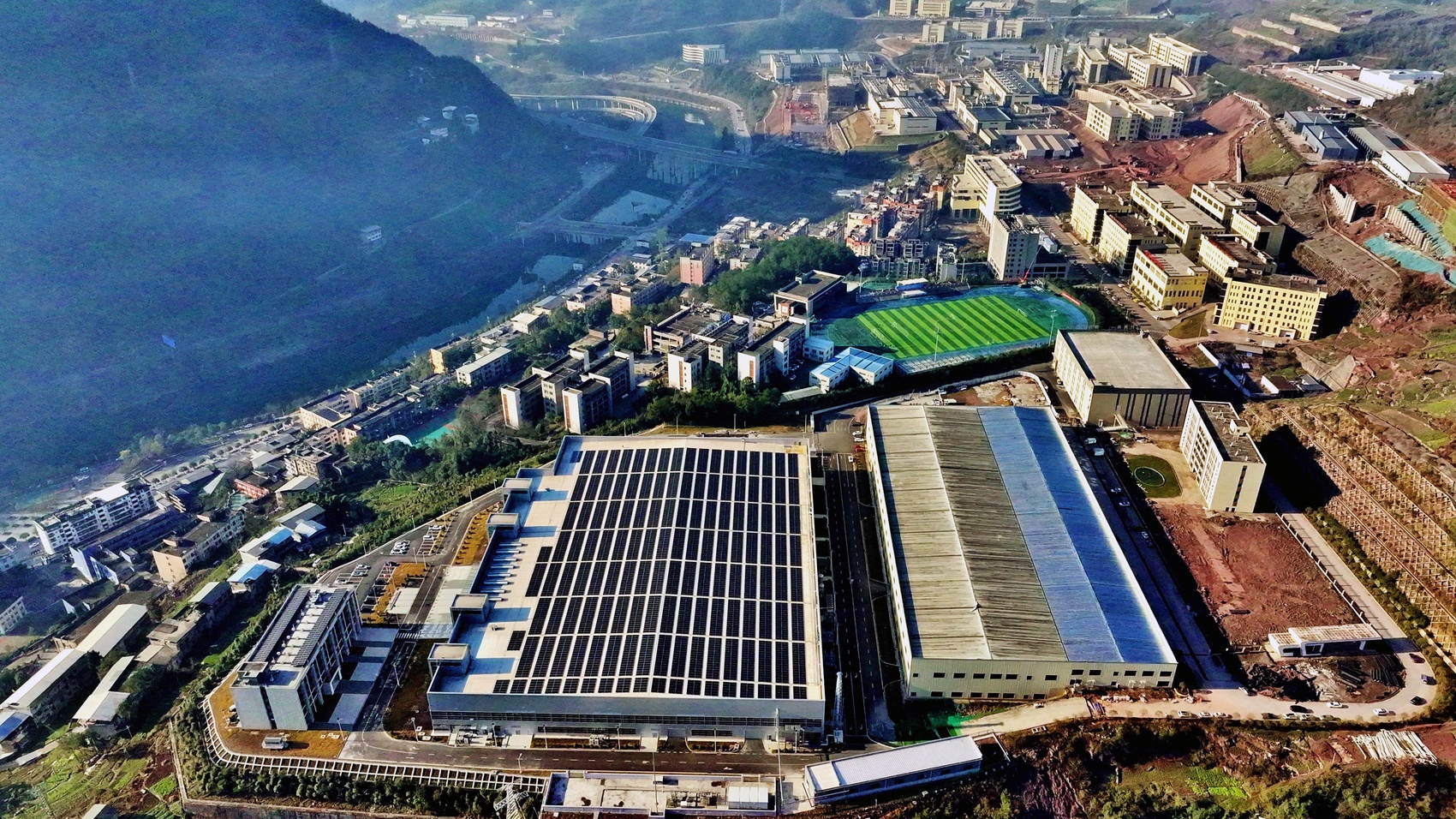 1月6日,巴中市经济开发区南江工业园彰显绿色理念的三一硅能厂房光伏板覆盖的屋顶与周边成片的工厂建筑群、民房及道路、河流、青山、蓝天构成一幅产城融合发展新画卷。 肖定怀 摄