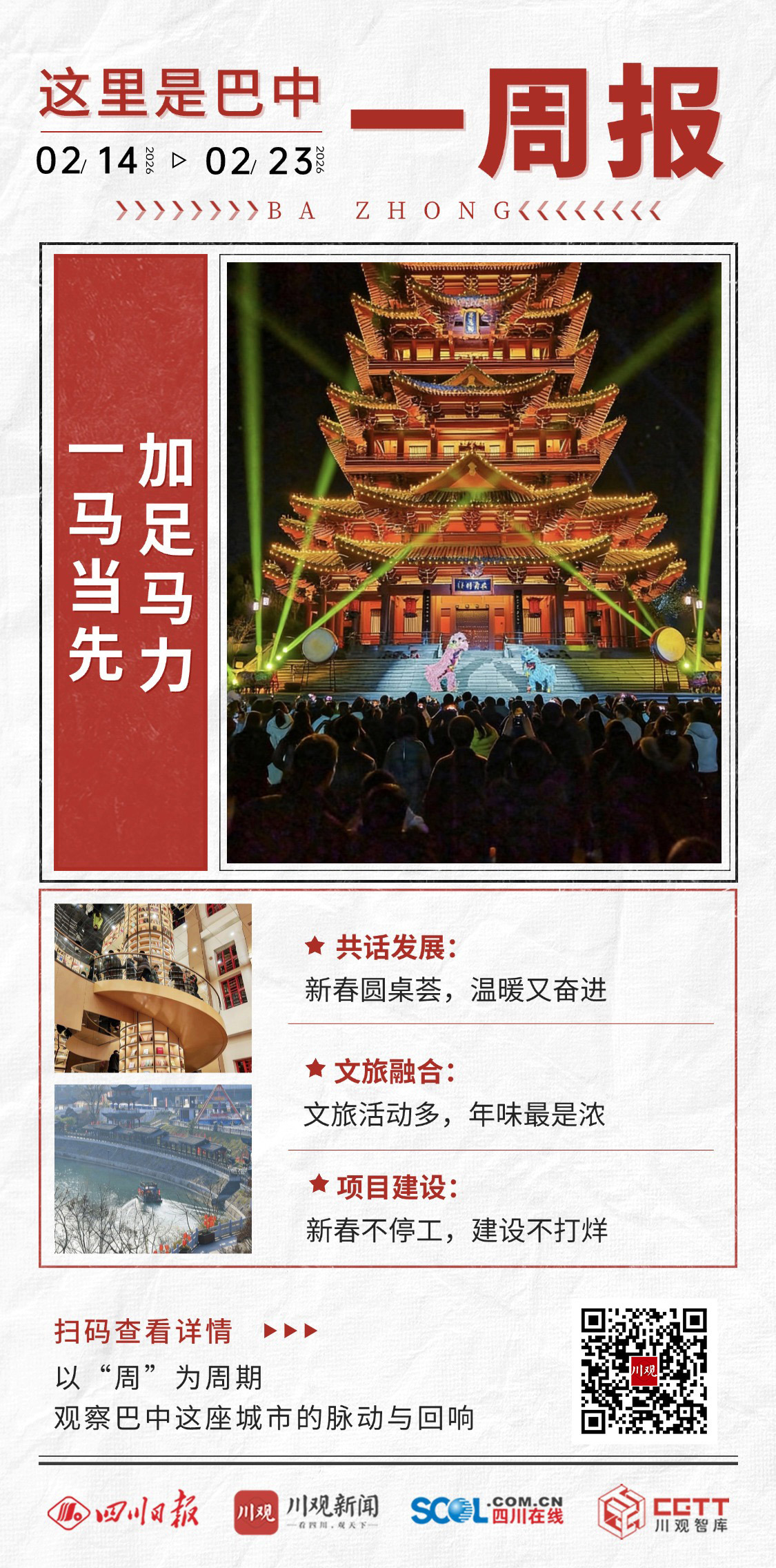 逢上史上最长春节假期,本期一周报将时间拉长到2月14日至23日。这期间,巴城张灯结彩,沉浸在喜庆祥和的春节假期中。在春节假期前一天,2月14日,巴中举行返乡人才新春圆桌荟,共商发展大计。而长达九天的长假中,巴中各地举办了丰富多彩的文旅活动,处处是年味。在万家灯火团圆时,巴中的一些项目建设却没有打烊,除了坚守在一线的建设工人,交通运输线上也答好春运大考,巴中铁路、公路运输有速度也有温度,为每一位出行者护航。